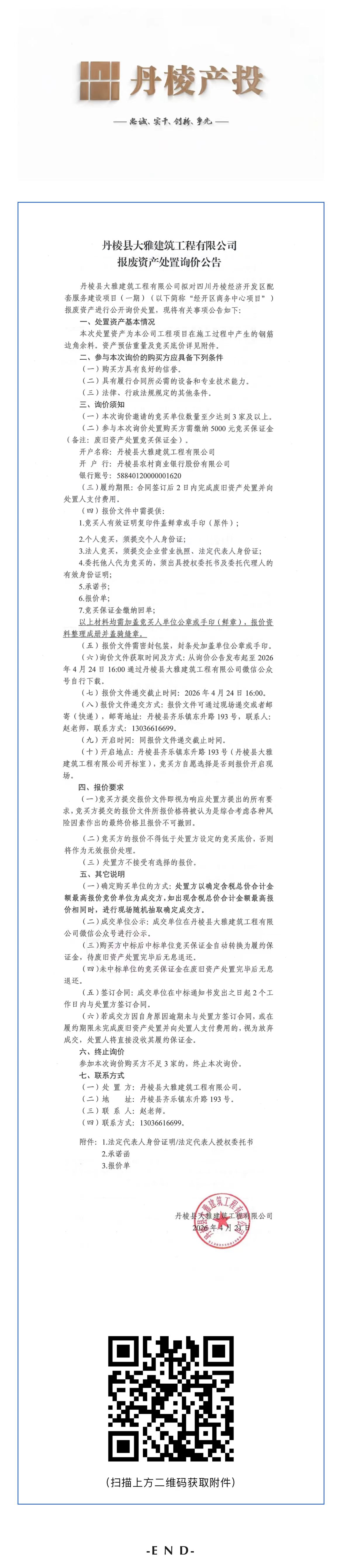 丹棱縣大雅建筑工程有限公司報廢資產(chǎn)處置詢價公告